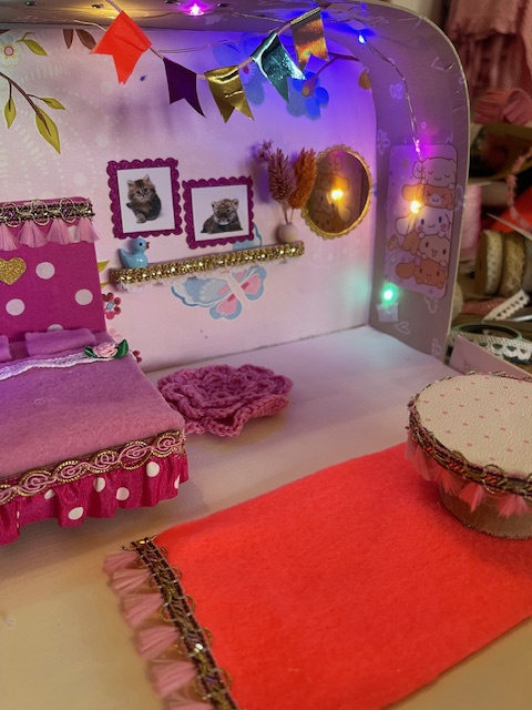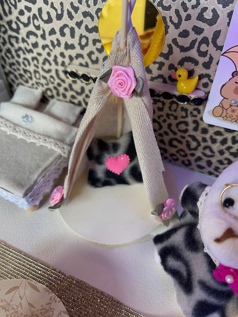 Daarna mag je een knuffeltjke kiezen, er zijn verschillende knuffeltjes. Je krijgt verschillende stofjes voor je bedje, kleedje of kleding voor je knuffel, maak je een eigen tafel en bedje en lief tipi tentje en versier je het huisje met stickertjes en plaatjes. En natuurlijk als laatste ook nog een kleurrijke verlichting in het koffertje.